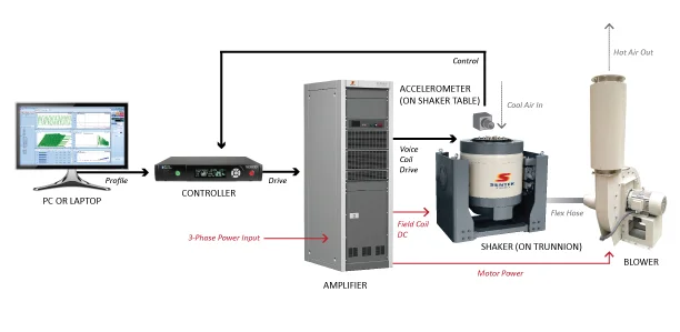 Figure 1: Basic components of an electrodynamic vibration testing system.